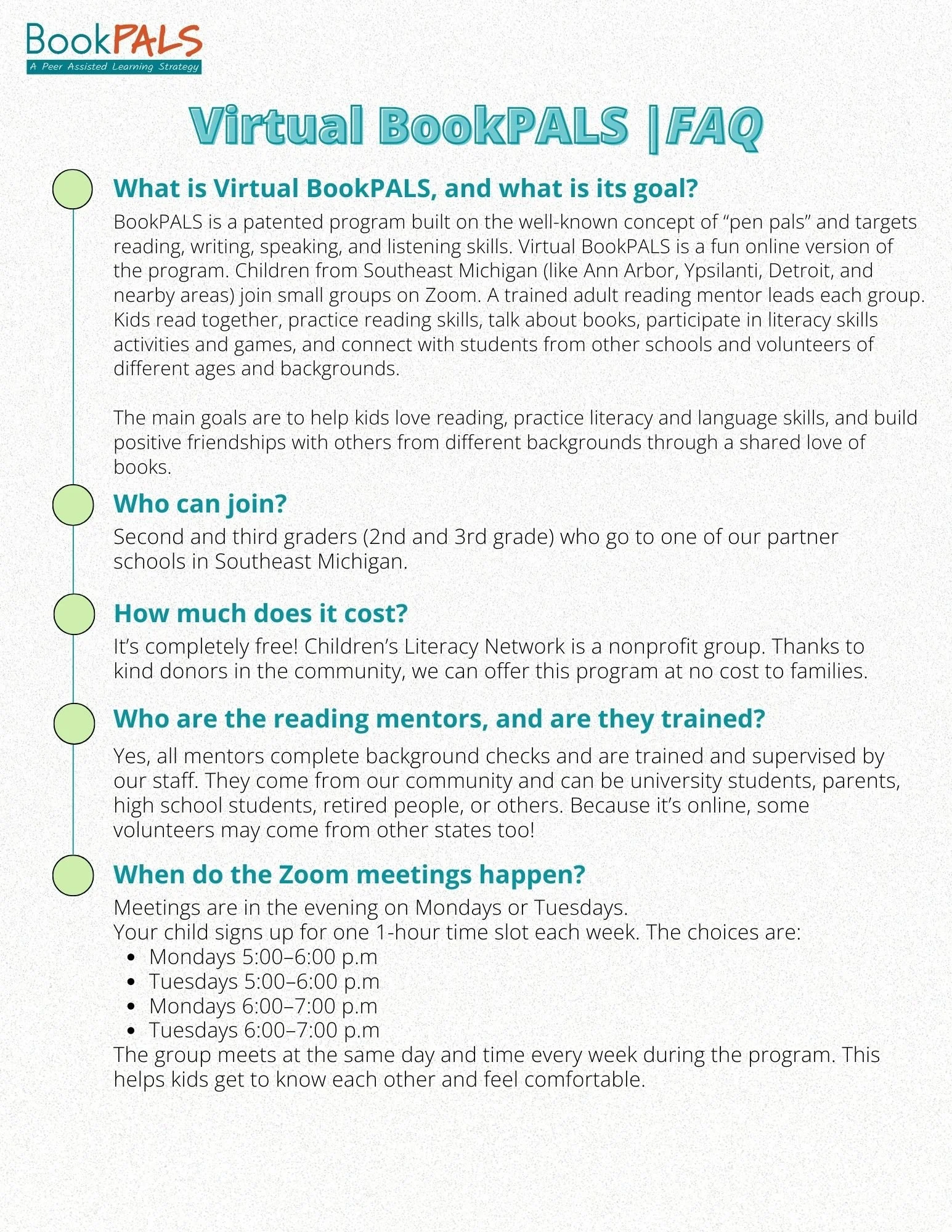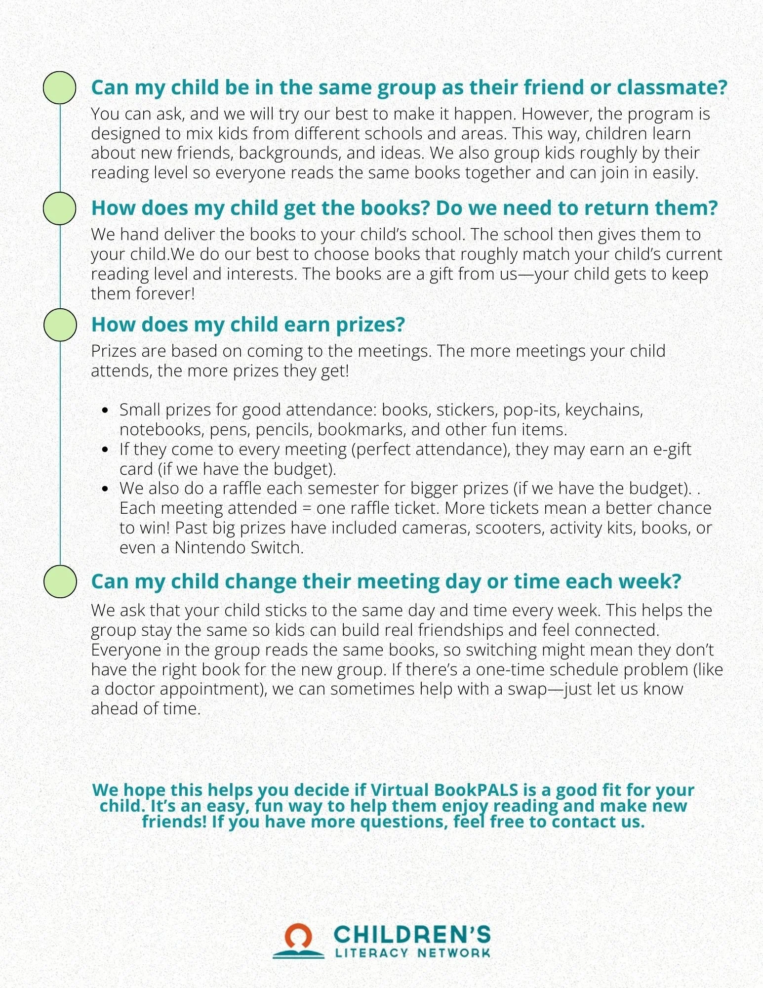 Interested in Virtual BookPALS? Contact our Virtual Coordinator, Rosa@childrensliteracynetwork.org